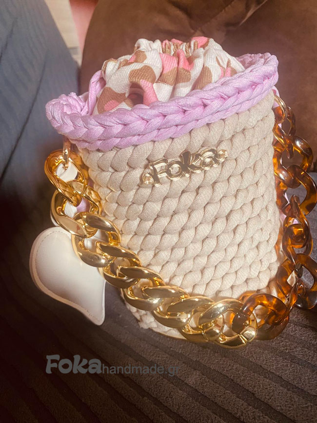 Ένα πουγκί τσάντα στρογγυλό , με ξύλινο πάτο,