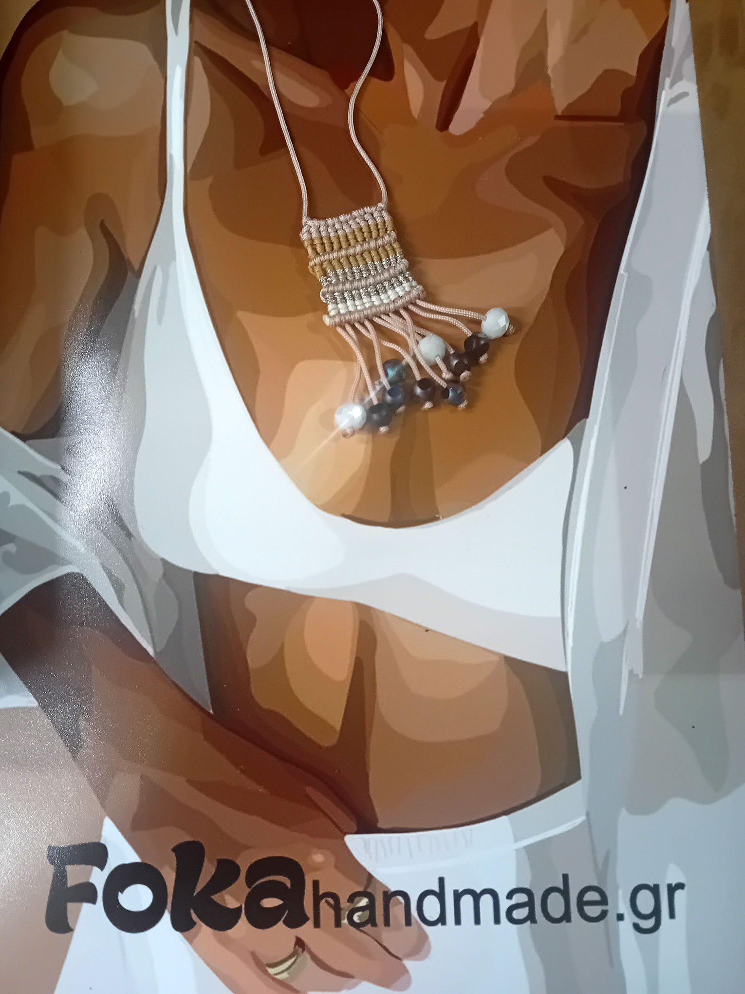 Μακραμέ κολιέ με μήματα σε γήινους τόνους και γυάλινες χάνδρες.
